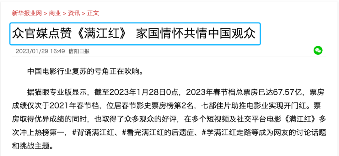 文章称,在获得观众好评如潮的同时,《满江红》所表达的家国情怀、文化传承,也得到人民日报、新华社、中央广播电视总台等诸多官媒的点赞。