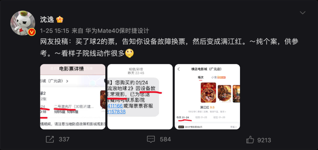 1月25日,沈逸曾发布网友投稿,该网友表示1月24日购买《流浪地球2》因设备故障无法正常观影,已退款,但随后发现同时段同场次改售《满江红》,“看样子院线动作很多”。他还回复了评论“设备只对球2有故障”:“有其他故障的随时发过来看看呗”。