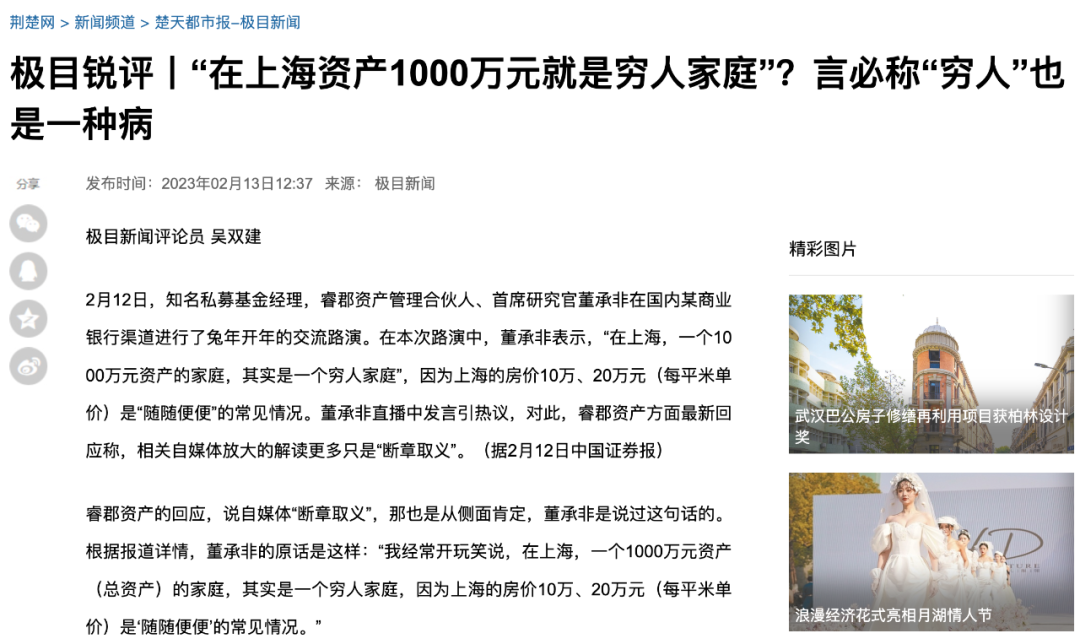 文章称,一个做私募基金的经理,老是提到“穷人”干啥?还动不动1000万元资产的家庭在上海是穷人家庭?这不就是在渲染财富焦虑吗?