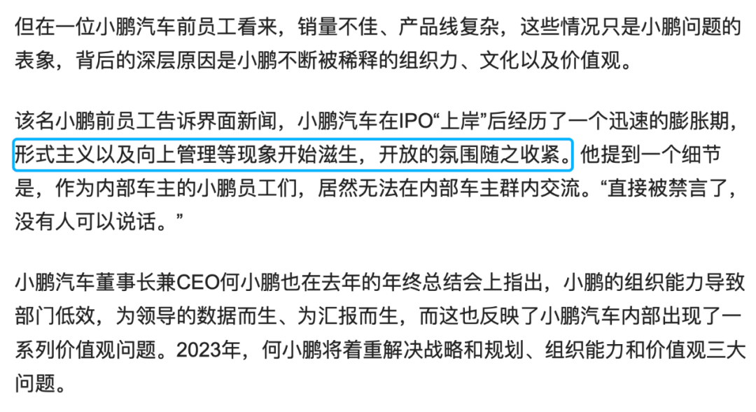 去年的年终总结会上,何小鹏对内部的问题提出了批评,直指小鹏的组织能力导致部门低效,为领导的数据而生、为汇报而生。
