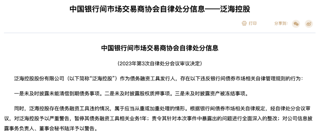 2月24日,中国银行间市场交易商协会自律处分信息显示,泛海控股作为债务融资工具发行人,存在违反相关自律管理规则的行为:
