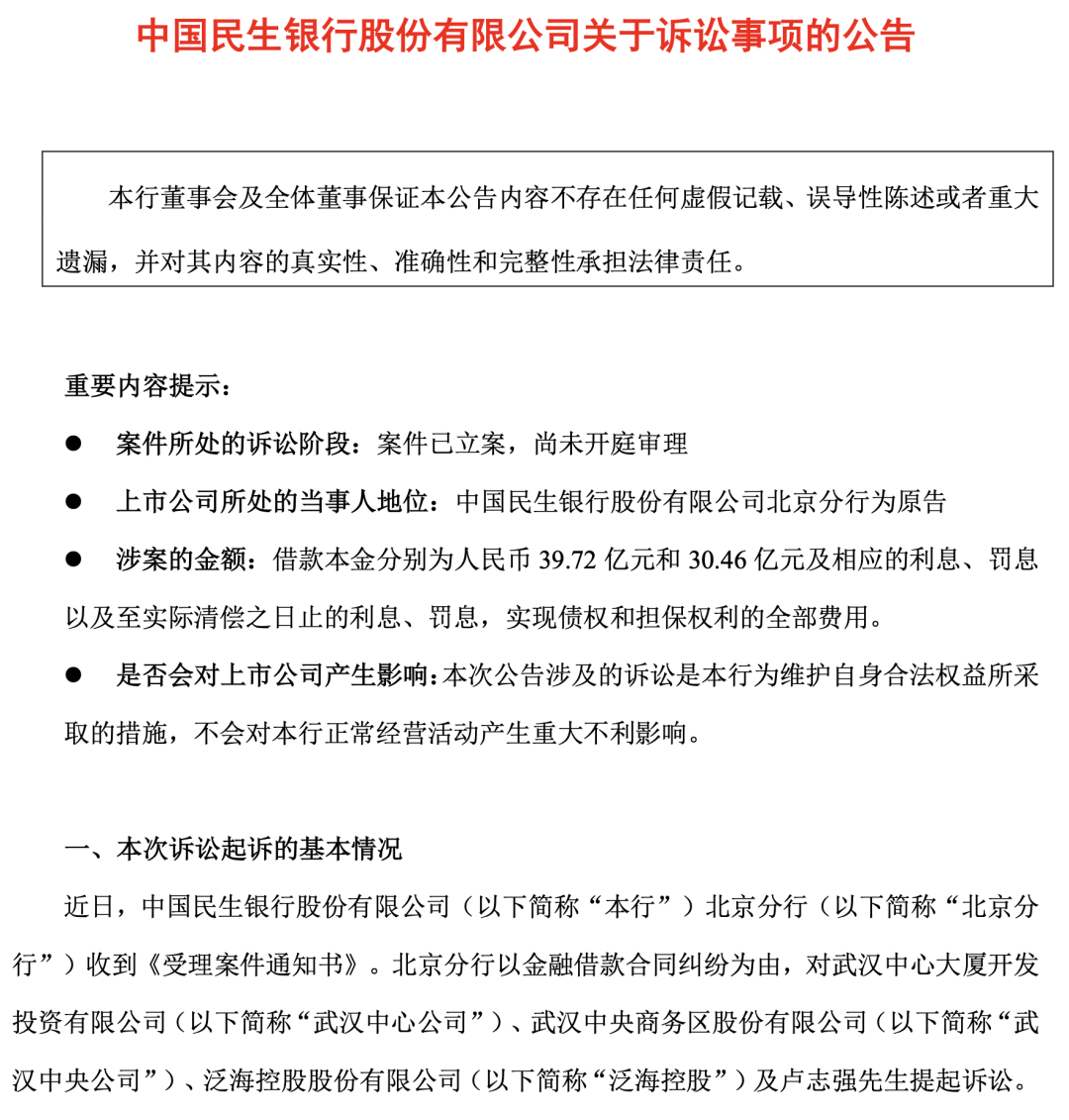 一个月前,民生银行北京分行发布公告称,因为70亿的借款问题起诉了自己的股东卢志强及泛海控股、武汉中心公司和武汉中央公司,卢志强和泛海控股是前述两家公司的担保人。