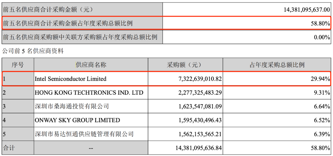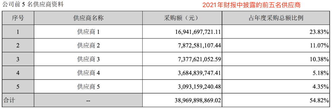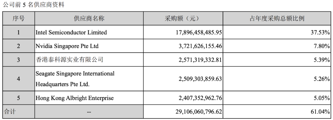 值得注意的是,从2020年开始,浪潮信息财报中不再披露前五名供应商的具体名称,而是用“供应商1”、“ 供应商2”等代替。