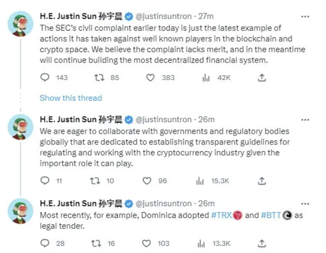 对于SEC指控,孙宇晨3月23日在社交媒体发文称,他认为美国证监会(SEC)对其本人及旗下三家公司的起诉状“缺乏依据”,“我们将继续建立最去中心化的金融系统”。