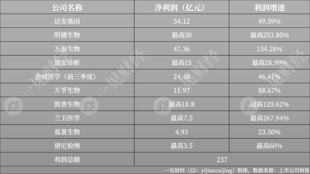 近期,十家核酸检测相关上市公司陆续公布了2022年业绩预告及年报,一见财经整理发现,十家上市公司去年的净利润总额达到237亿。