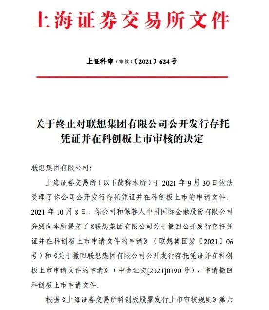 当晚,上交所发布2021年624号公文,题为《关于终止对联想集团有限公司公开发行存托凭证并在科创板上市审核的决定》(下称《决定》)。