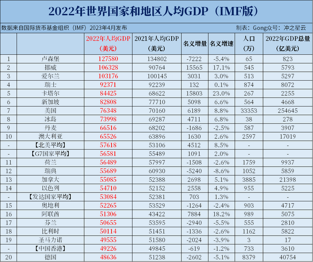 最近,国际货币基金组织IMF公布了最新测算的2022年世界各个国家和地区的GDP和人均GDP。总体而言,大多数国家和地区GDP和人均GDP变化略有增长。