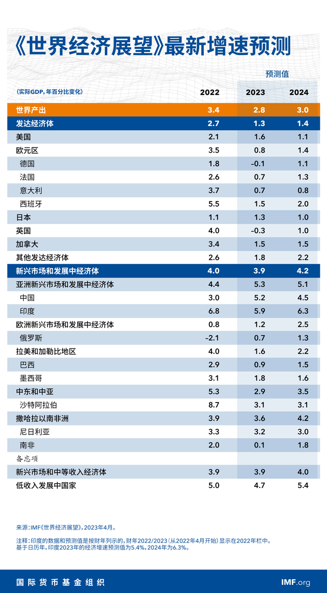 IMF指出,2023年全球经济增速将为2.8%,比3个月前的预测值2.9%下调了0.1个百分点,低于2022年的3.4%。同时IMF预测,2024年全球经济增长可能平稳在3.0%。这种下降在一定程度上是因为中国、韩国等一些过去快速增长的经济体增长的放缓。