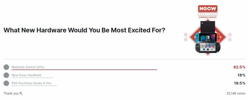 今年上半年,IGN发起了一项“最期待的游戏机”的投票,吸引了超过25000人参与,其中Switch新机型的人气达到了62.5%。