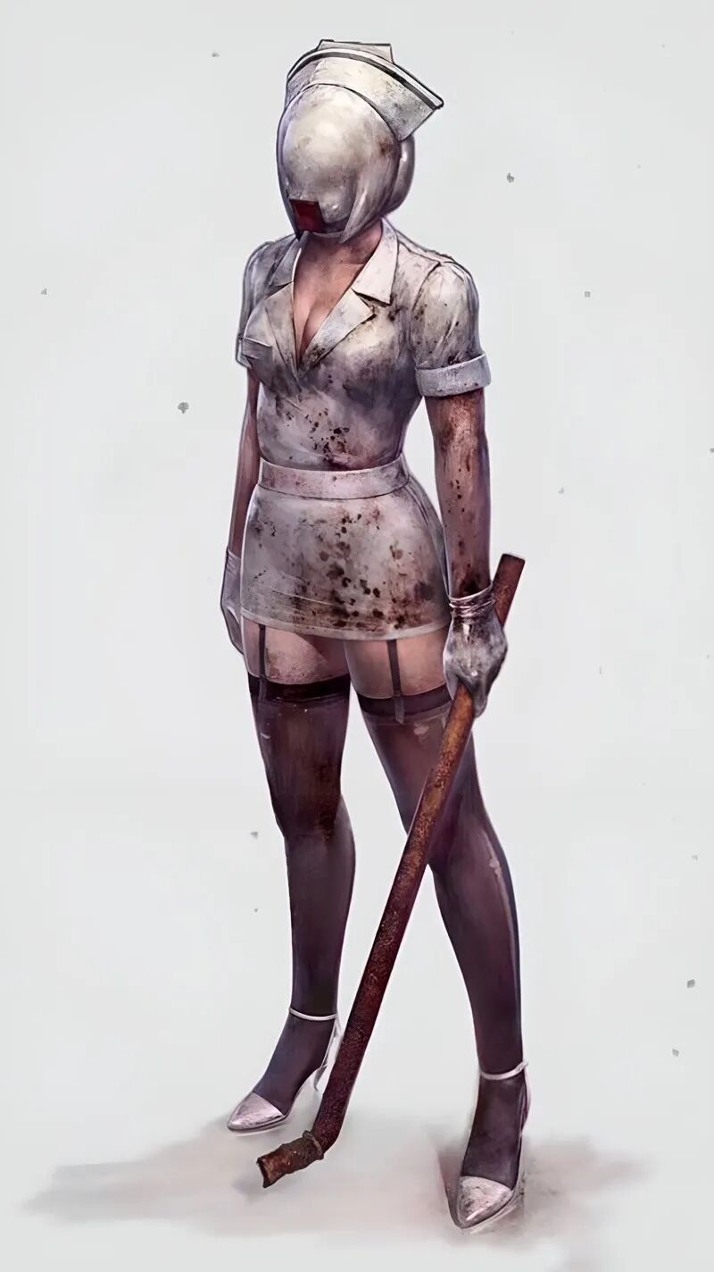 而前一阵《寂静岭2重制版》概念图中的护士黑丝,也是耐人寻味——尽管游戏尚未问世,但未出现的往往更值得遐想。不同于历代作品中的死灰色白裤袜,这次护士腿部的连裤袜换成了吊带式黑丝。它包裹住了部分丰满诱人的大腿和整段纤细修长的小腿,并将下端视觉的尽头收束于一双银白色的尖头高跟鞋当中——黑与白的交织,既是吊带与高跟绑带对身体曲线的束缚,也代表着对欲望和灵魂的束缚。