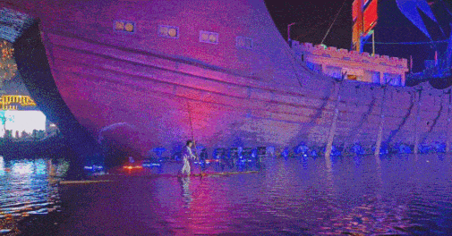这边,武松和数位官差行至阔板桥上表演“大闹飞云浦”,他飞起一脚,直接将官差从桥上踹入水中;而那边的“神舟”之旁,有人立于孤舟之上,纵一苇而渡江,或前附、或后仰。