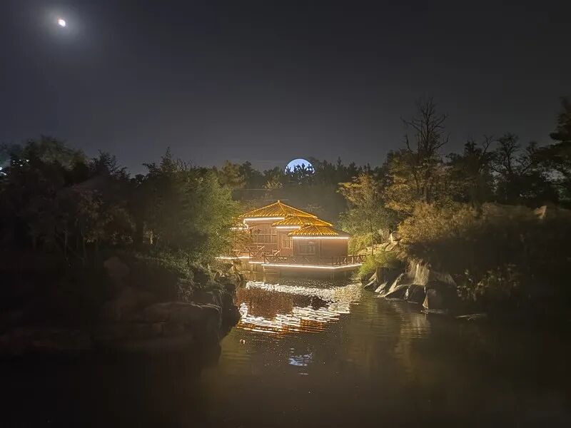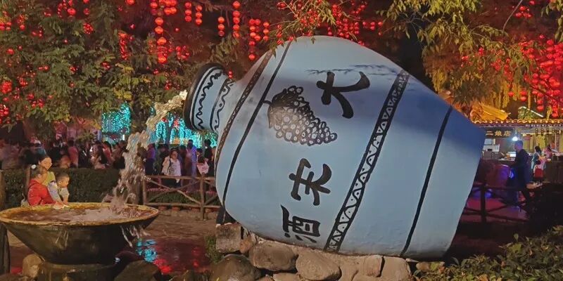 短暂的休息之后,我们到了万岁山大宋武侠城——这园区倒是颇为还原武侠风貌,山水花树酒倒是一样不少,古色古香的建筑内毫不吝啬的灯光效果铺满了园区。走过漫天飘零的红灯笼,你还能在路边偶遇一下“孙二娘包子店”。