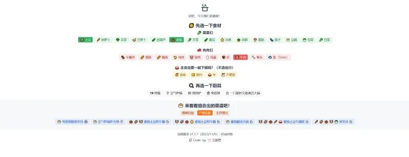 网站的功能大概就是能够根据你选择的食材和烹饪工具快速生成对应的菜谱。