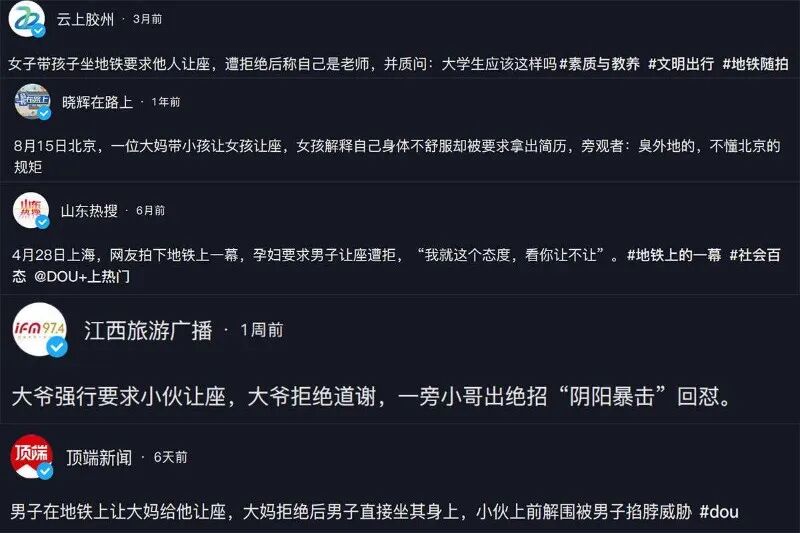 这是我在新设备、未登录账号的情况下搜索“让座”出现的前五条结果。