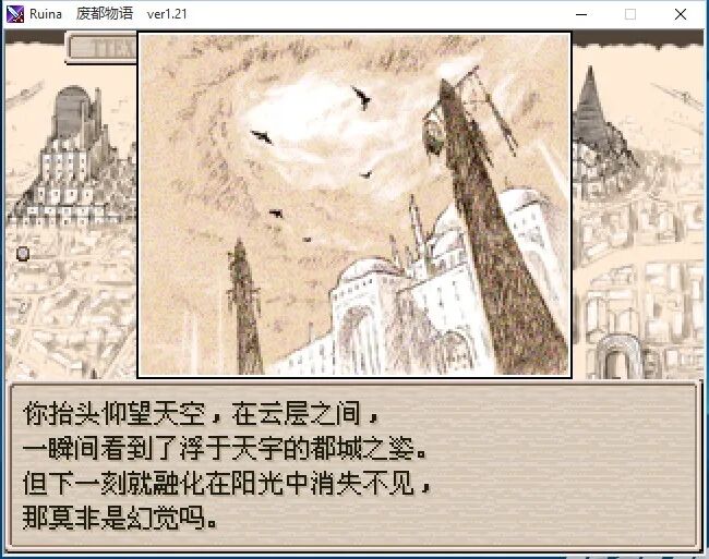 许多年过去后,我也玩到了越来越多的RM游戏,其中印象最深刻的,当然是《废都物语》。它在当时的RM游戏中无疑是异类,没有行走图与RM系统绘制的地图,而是使用了手绘的静态地图,并用大量的文字描述辅以CG插画,打造出了一种类似跑团的独特体验。无论过去了多久,它在我的心目中都仍然是无可挑剔的满分游戏。