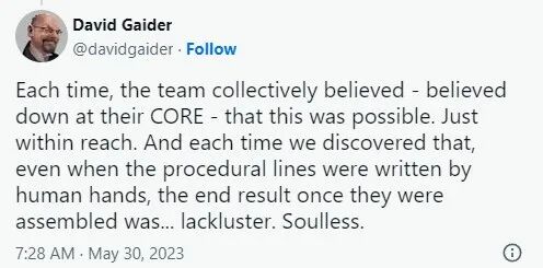 前《龙腾世纪》叙事负责人David Gaider就对它的前景表示悲观,他认为这些由AI生成的内容是肤浅的,没有灵魂。