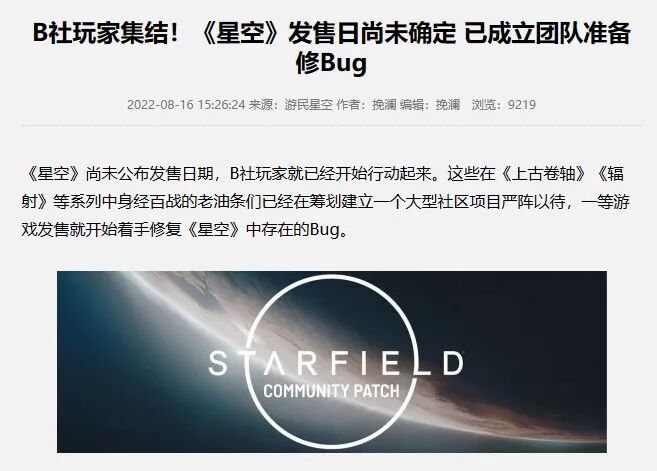 另一方面,B社自己的前科也不那么让人放心,它是一家以让玩家修Bug为名的公司。《辐射3》时代的4GB补丁就是玩家为了修复游戏不识别4GB以上内存的问题、减少游戏跳出而自己做的。粉丝们也非常了解B社这项留Bug给玩家修这项光荣传统,早在一年前《星空》发售日还没有公布的时候,这群老粉们已经组成了一个名为Starfield Community Patch的组织严阵以待,准备给B社擦屁股,也算是游戏圈的一道奇景。