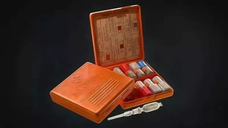 这个小玩意在现实中是一种苏联时期生产的小型急救包,一个小盒里就包括了止疼药、抗生素、抗辐射药等多种药品。起初我不过是感叹这个小方盒居然如此黑科技,然而随着游戏阅历的增加,我发现战斗民族做的射击游戏,尤其是废土游戏,哪都是这玩意的身影。