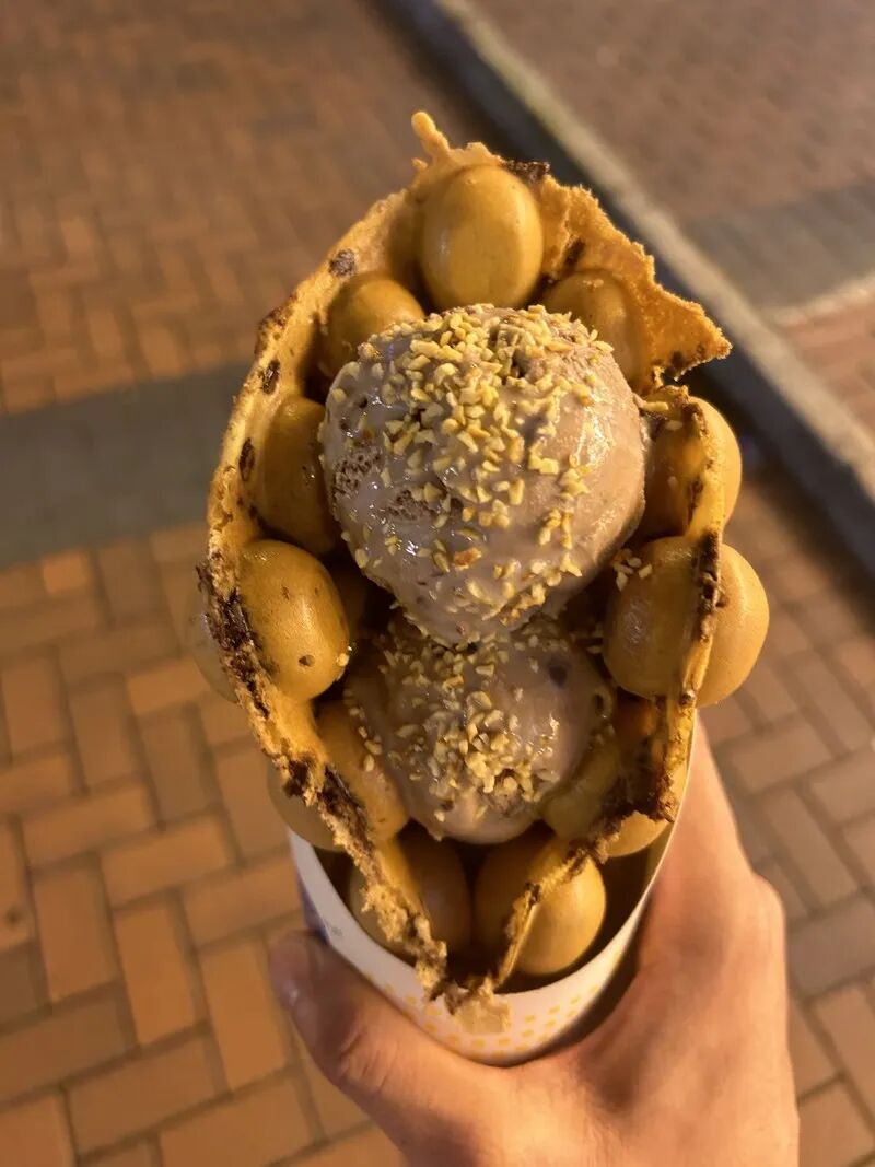不过,这趟旅程带给我的也并非都是不适,在香港夜晚的街头上,你可以随时看见踩着滑板的潮人和妆容精致的俊男靓女,他们自由奔放的性格让我深受感染。庙街夜市的妈妈牌鸡蛋仔也是一绝,鸡蛋仔外脆里嫩,中间再堆上两个冰淇淋球,简直是人间美味。