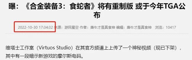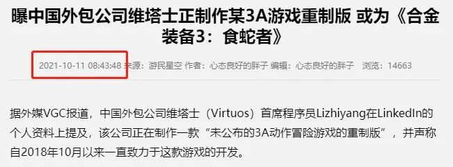 关于“《合金装备3》重制版”的传言,则早在2021年就已经出现,当时被曝光负责项目的是中国厂商维塔士(Virtuos)。