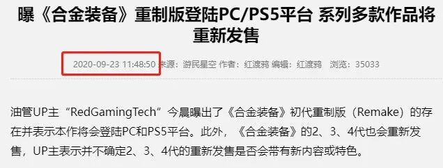 如果再往前找,就到了2020年。当时的传言还是《合金装备》即将被重制的不是三代而是初代,负责制作的公司也从维塔士变成了负责过《恶魔之魂》重制版的蓝点工作室。