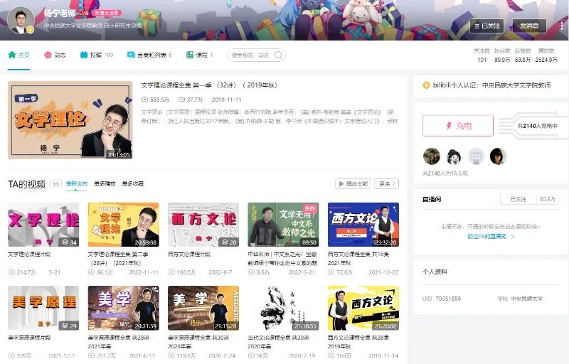 我最喜欢的网课up,增长知识还是其次的,最主要的是有意思。文学理论这种枯燥又抽象的玩意都能讲得深入浅出妙趣横生,当相声听也是极好的。