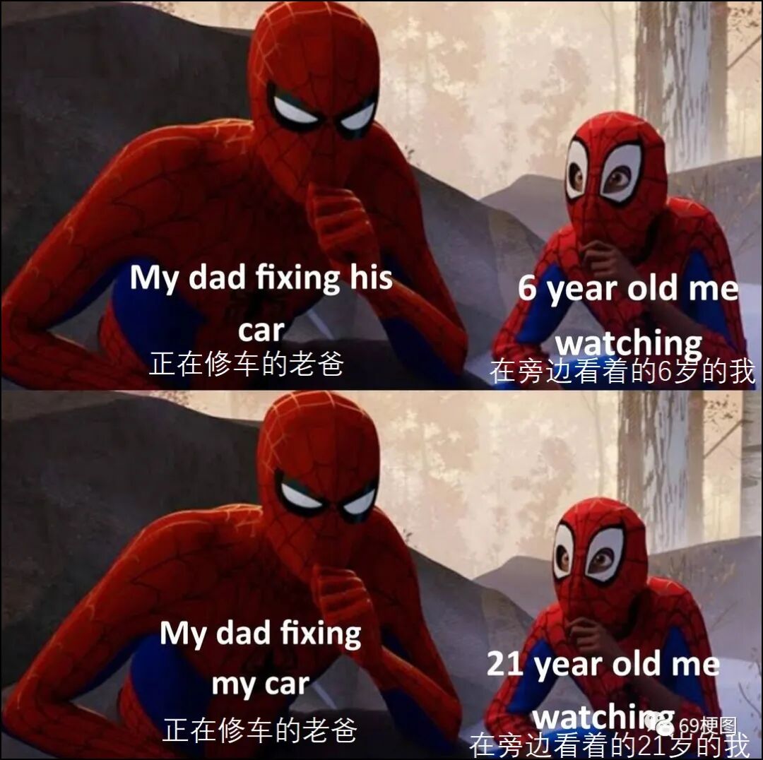 梗图合集:正在修车的老爸 VS 在旁边看着的6岁的我