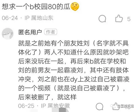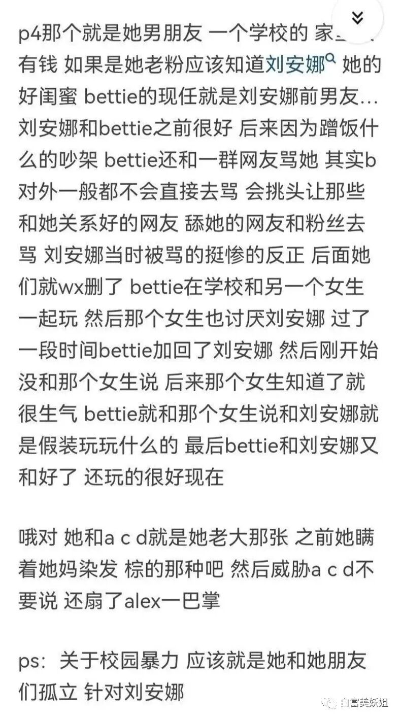 这个瓜其实是几年前的了,内容大意是:B姐曾和一个叫刘安娜的女生是闺蜜,后来两人之间不知道发生了什么,B姐就带着自己的小团体孤立、排挤了刘安娜。