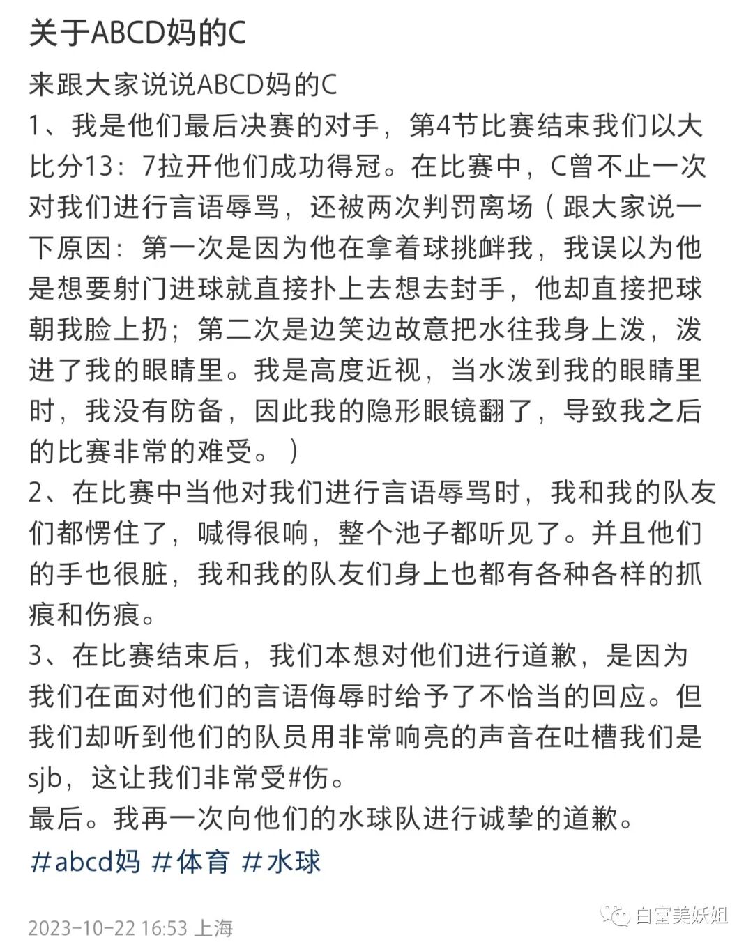至于咋打起来的,大体意思是在一场水球比赛中,参赛两队发生了冲突,从言语辱骂上升到了肢体冲突,导致两队成员身上都带了伤。
