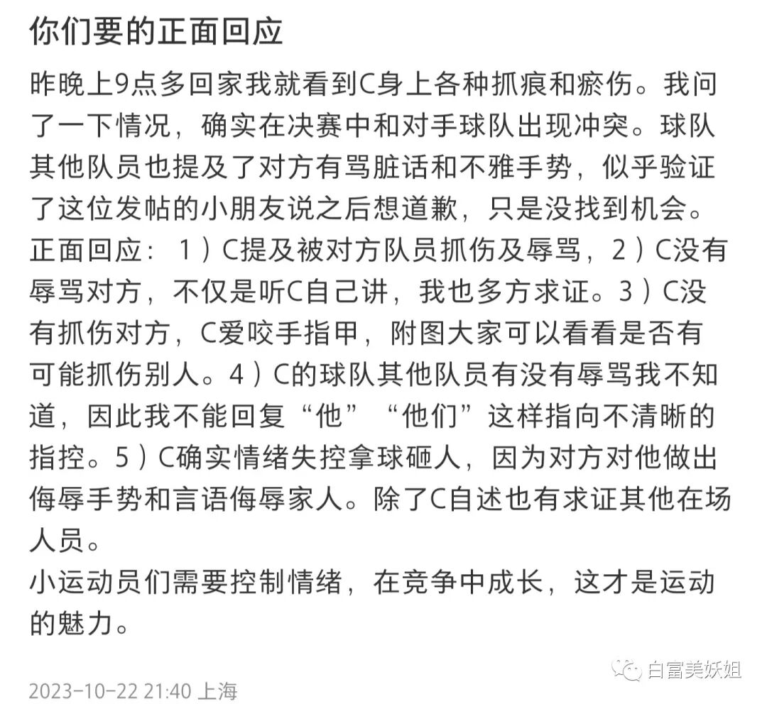 虽然这个料乍一听很吓人,但金妈给出的解释还是令人信服的,毕竟孩子在参加竞技体育时,难免在对抗中生气上头。而且,这个岁数的小孩,打打闹闹很正常。
