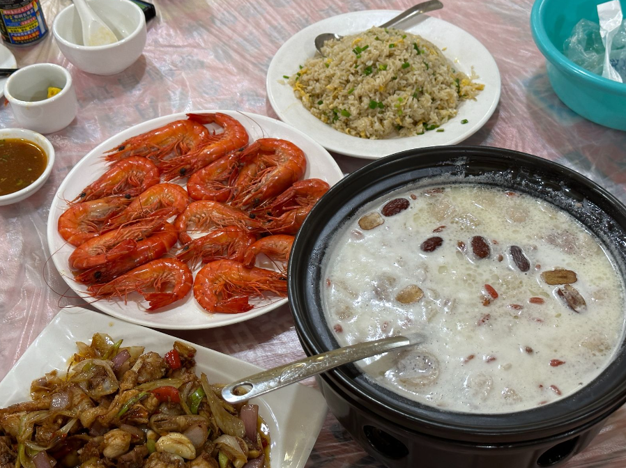 我们一行三人点了椰奶鸡、半只炒鸡、白灼虾和蛋炒饭,一共花了301,海鲜比较贵,但吃得超级撑。