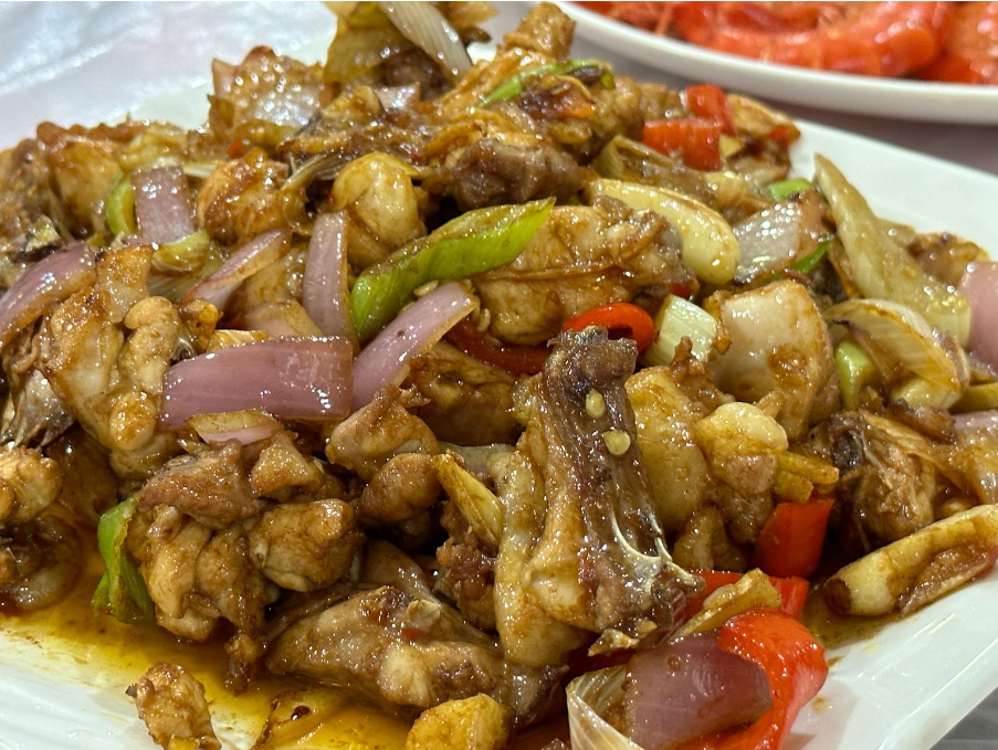 文昌鸡不仅熬煮好吃,应对煎炒烹饪也完全没在怕的。我们特地和服务员说了炒鸡要加辣椒,这盘鸡端上来的那一刻,爱鸡人的眼睛就直了,堪称色香味俱全——看起来金黄诱人,闻起来焦香四溢,吃起来更是细嫩多汁。不愧是文昌的鸡,好吃得没边了!我不允许任何爱吃鸡的人错过文昌鸡!