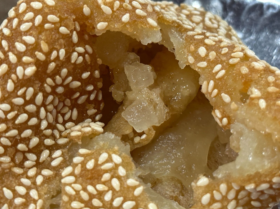 麻团炸得足够到位,还加了甜甜的馅料,和冰凉的红茶十分相配。
