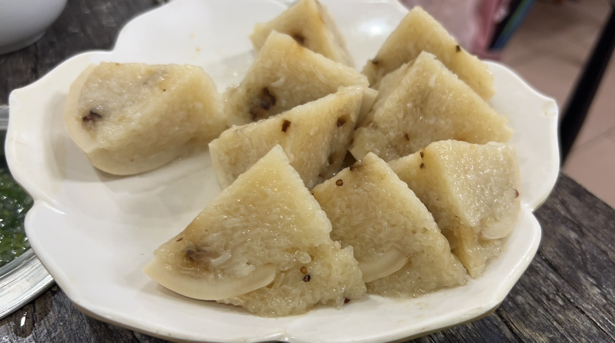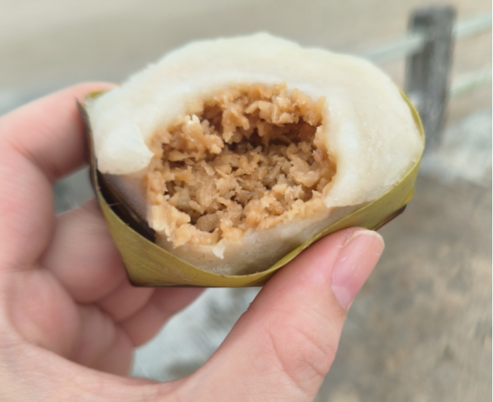 一个奶奶在路边卖的椰子糕,糯米包裹着红糖+椰蓉馅料,又香又甜又软又椰,馅料特别足。比排档和饭店的都好吃,只可惜可遇不可求。但如果你在东郊椰林看到一个奶奶卖椰子糕,可以花三块钱买一块试试。