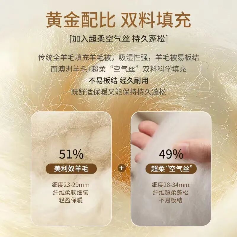 而这款“澳洲进口抗菌羊毛被”,在澳洲羊毛的基础上加入超柔空气丝,科学填充,比起100%羊毛被更不易板结,能让你用很久!