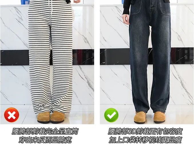 别不信,即使是肉眼看起来版型差不多的两条直筒裤,腰胯部or大腿处版型多一寸/少一寸,上身之后也是天差地别!!