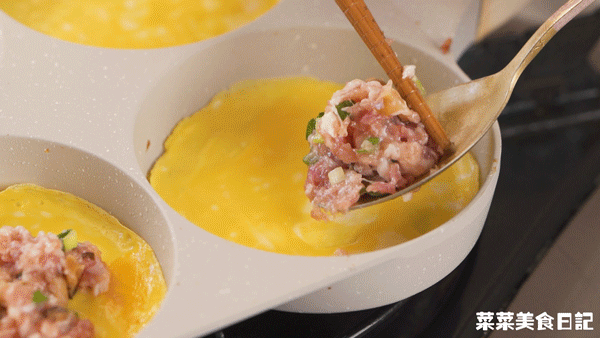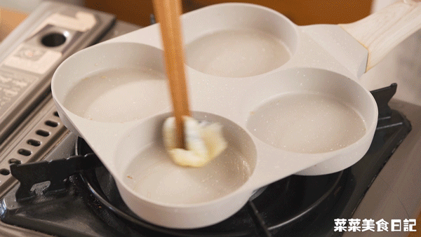 5.四连煎蛋锅加入少许油烧热,每个格子加入1大勺蛋液摊平