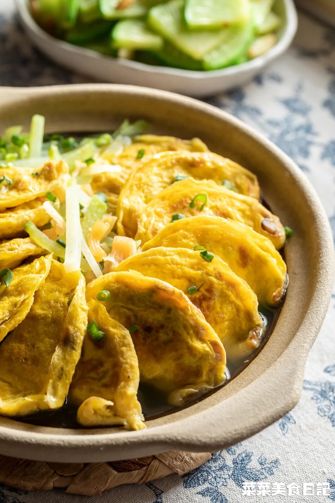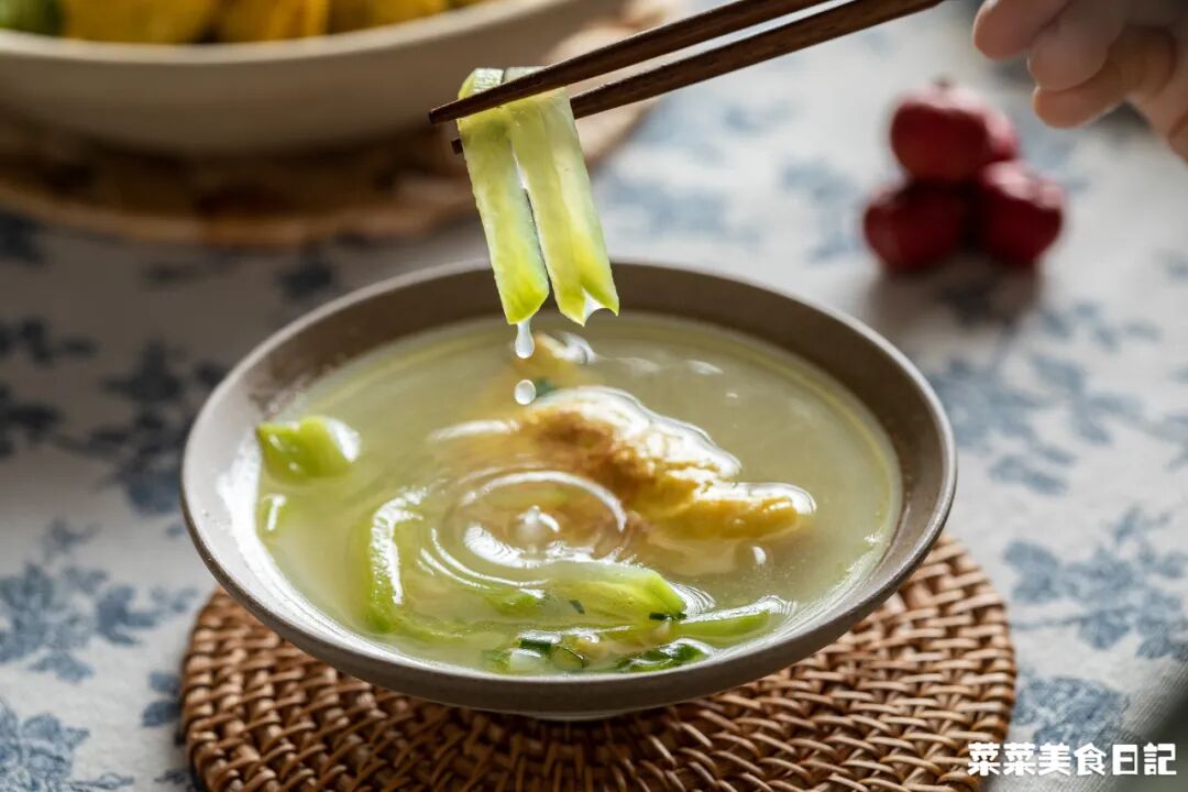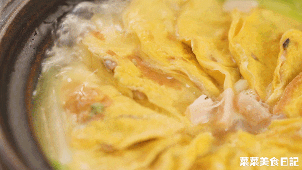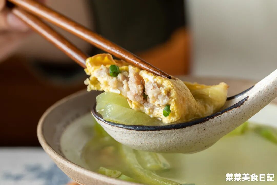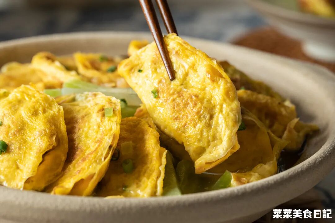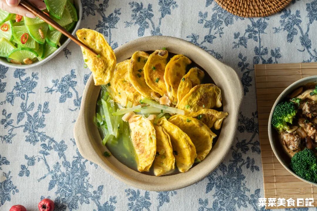 菜妈是客家人,爱把蛋饺和萝卜、芥菜等蔬菜煲一块儿,互相借味。