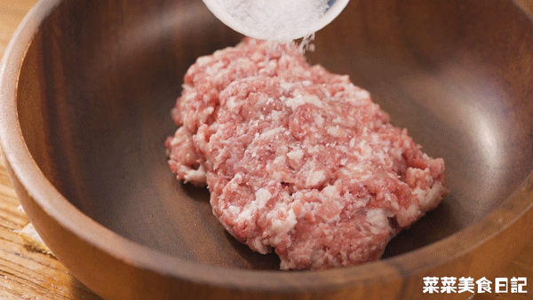3.料理盆加入剁好的猪肉糜、1大勺生抽、1大勺蚝油、1小勺盐、1小勺胡椒粉、2小勺淀粉搅拌上劲