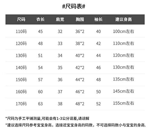 建议大家根据尺码表选择,如果喜欢宽松的亲,可以拍大一码哦,还可以多穿一年~