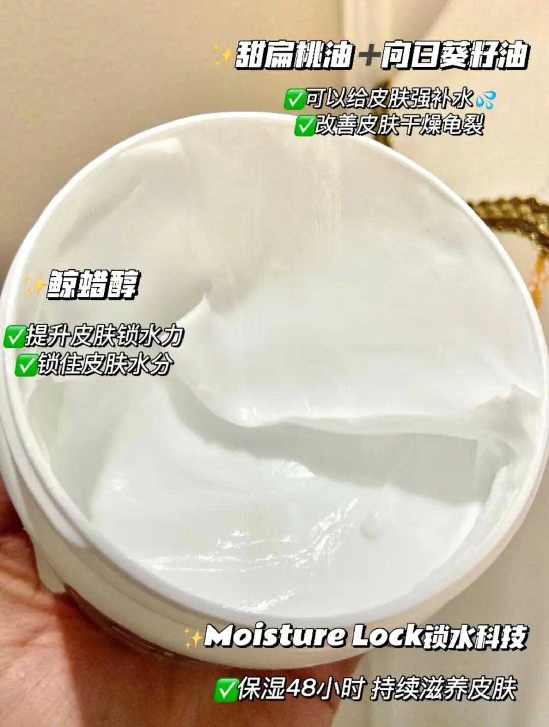 作为一枚成分党,最看中的是大白罐的甜扁桃油成分。这是一种天然的植物油脂,能深度滋润干燥肌肤,就连手肘、膝盖这些极其容易干燥部位,也能轻松柔化~