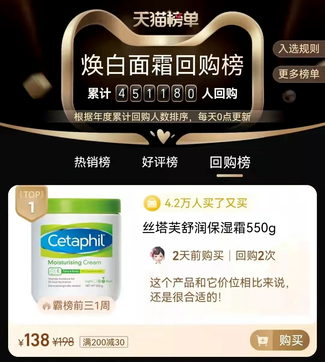 安全性和有效性可靠,得到很多皮肤科专家、儿科专家的推荐,认可度很高。所以哪怕在某猫那么多产品中,丝塔芙都可以稳居回购榜的“TOP 1”!