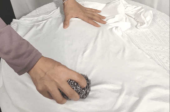 而且这种面料制成的打底衫还有一个好处,就是不会起球不会勾丝,你看我拿钢丝球用力刷衣服,也不会出现起球、抽丝的现象!