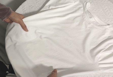这款打底衫的抗皱性和保形性能力都很好,用力揉搓衣服再打开,也不会褶皱影响衣服质感。