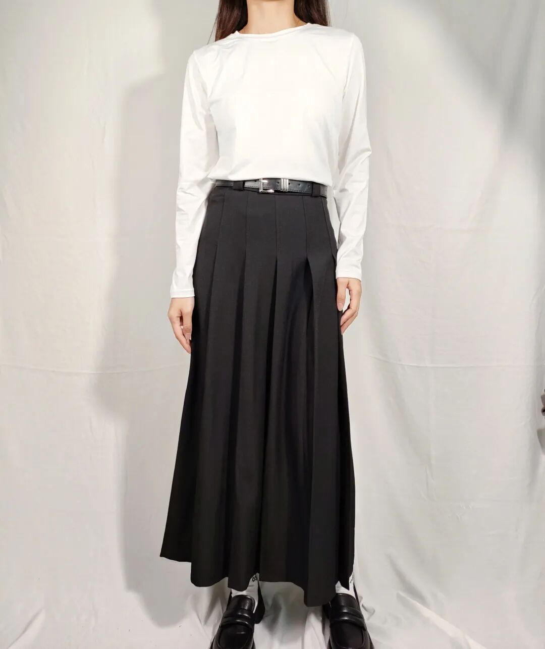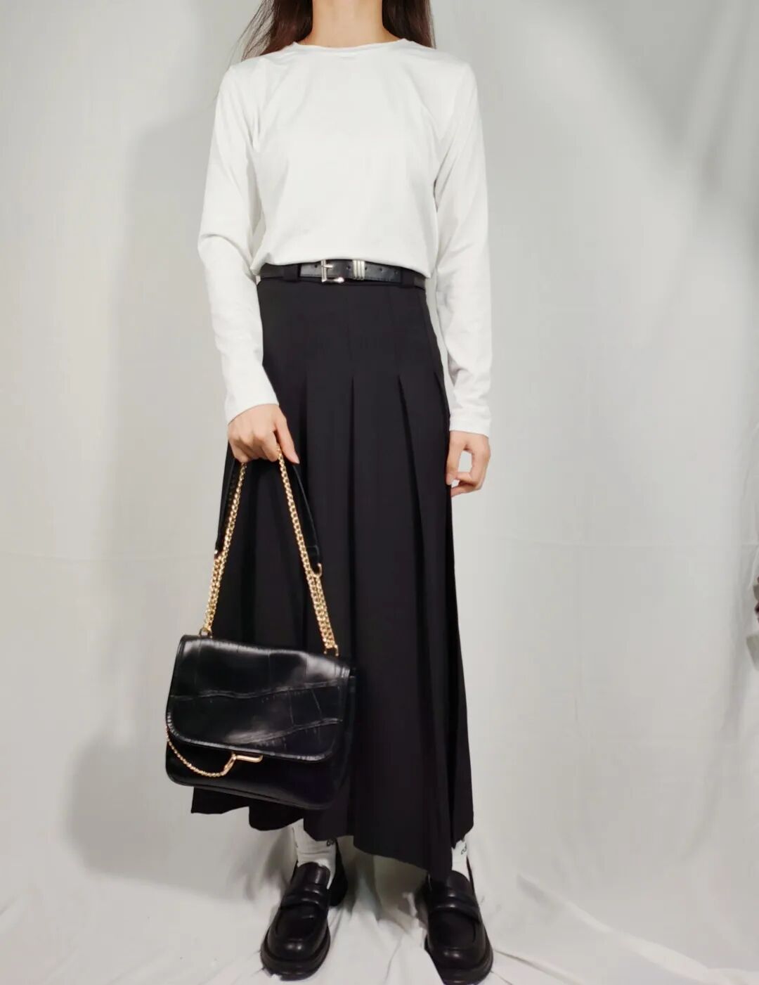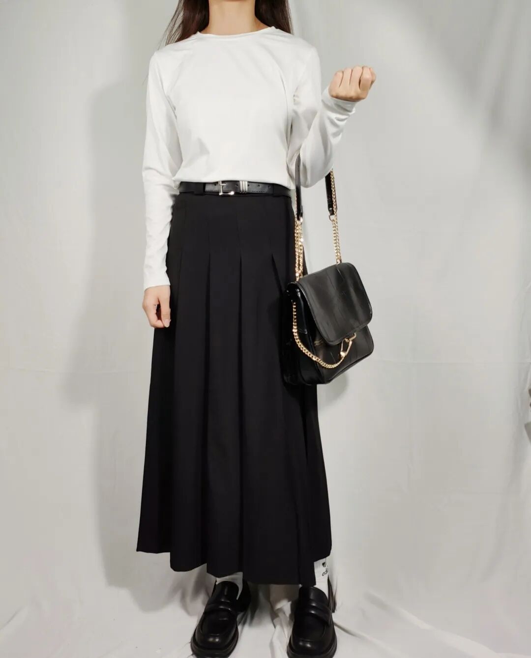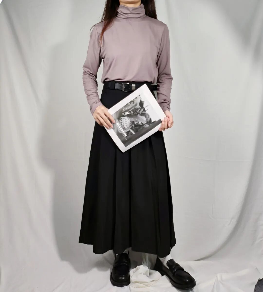 高领的设计让人感觉端庄大方,再搭配上一件黑色百褶长裙,则更加凸显了整个造型的高雅与典雅!