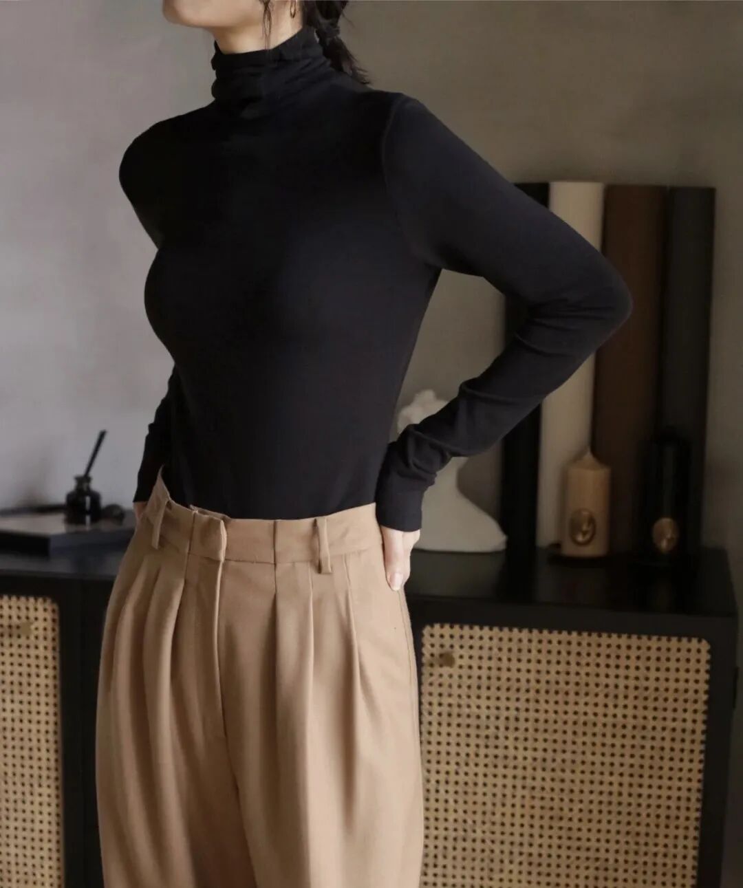 高领不挑脸型能很好的修饰颈部线条,领围舒适不勒,单穿时,下摆扎进下装,超显身材比例~