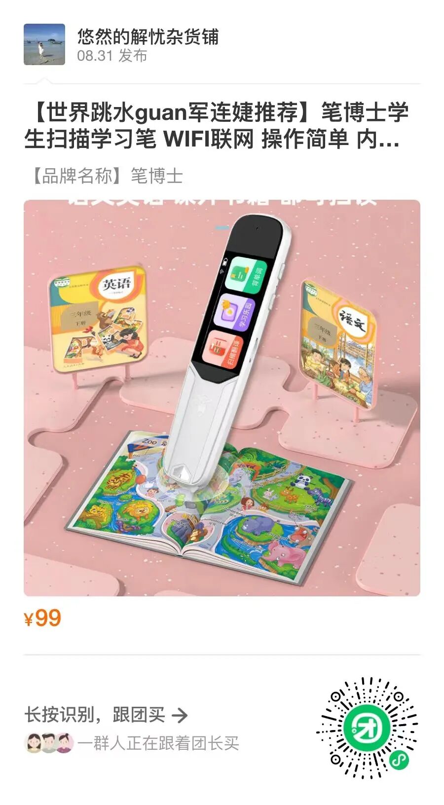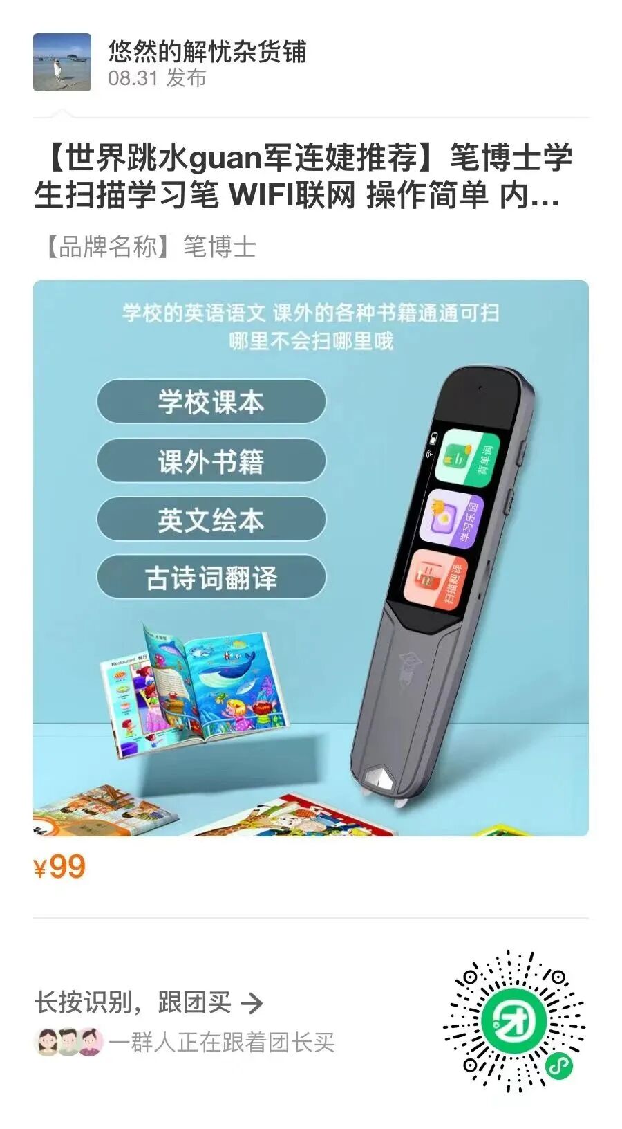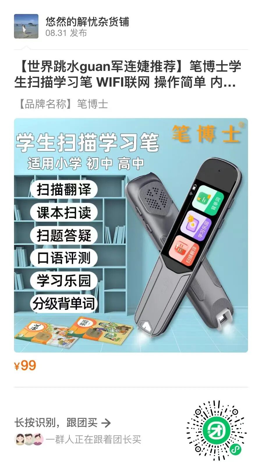 如果你遇到过给孩子辅导功课的时候发现自己都不会的情况,那么其实一个简单的扫描学习笔就能解决你的困扰~原价最少299/支的点读笔,今天粉丝福利价仅需99元!!