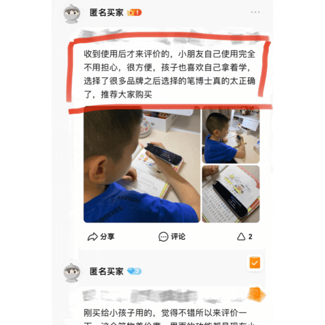 在孩子学习用品这方面我也是吃过不少的亏,相比起其他杂牌的扫描笔,笔博士扫描笔的灵敏度真的很高,触屏也是非常的舒服顺畅!