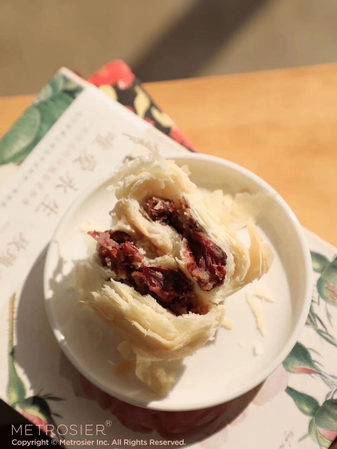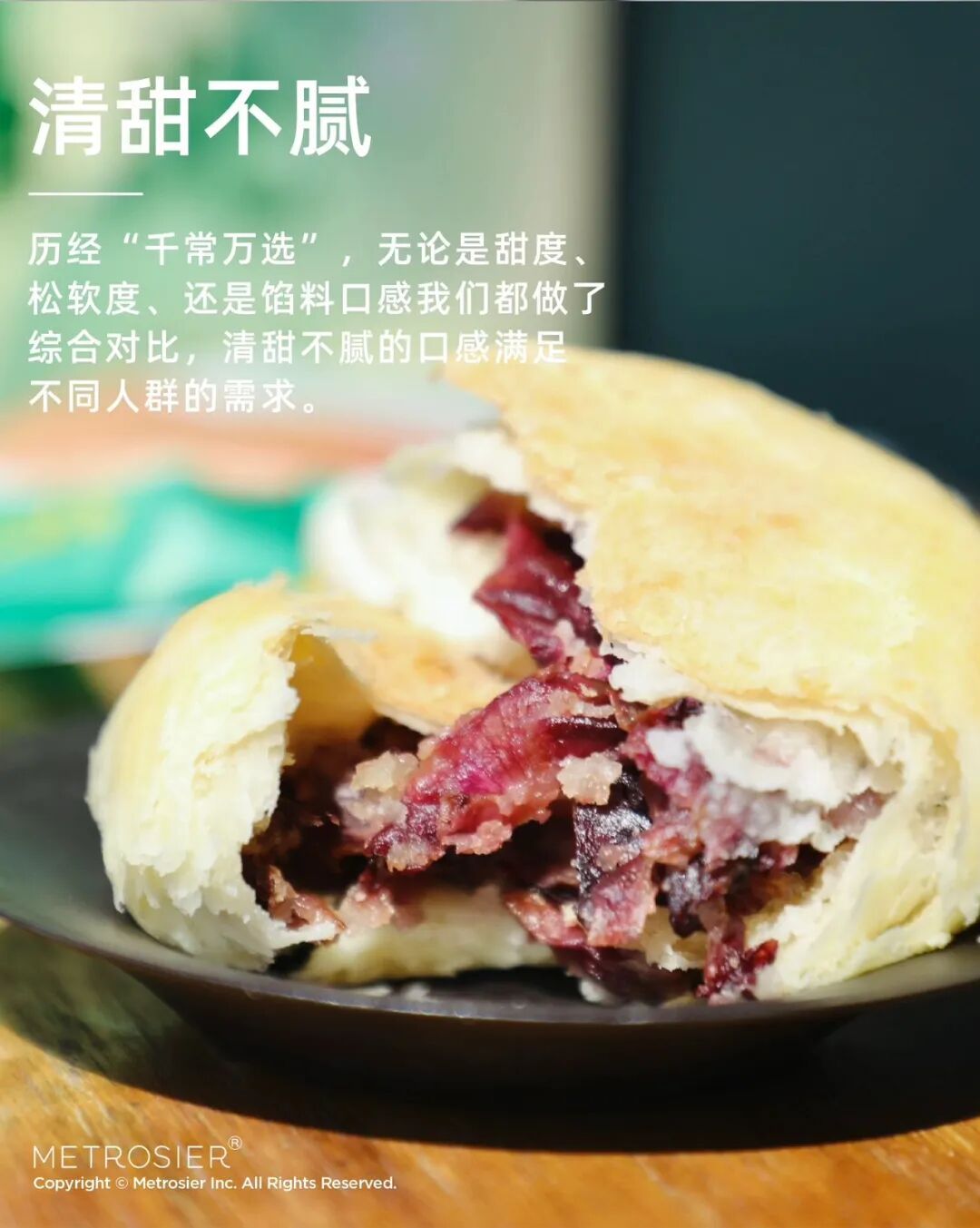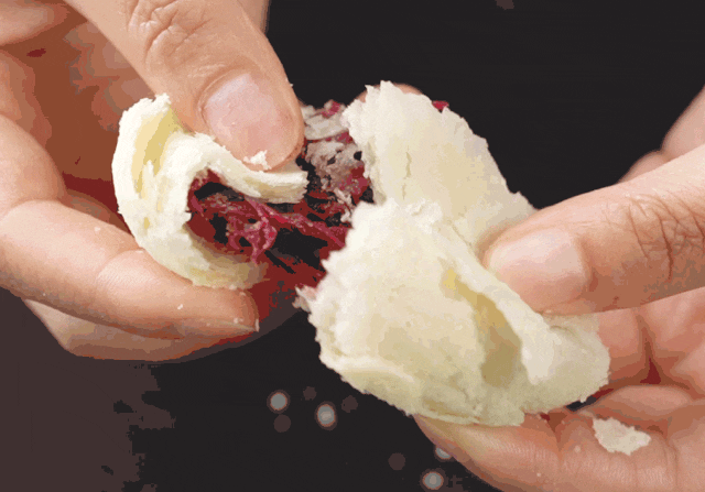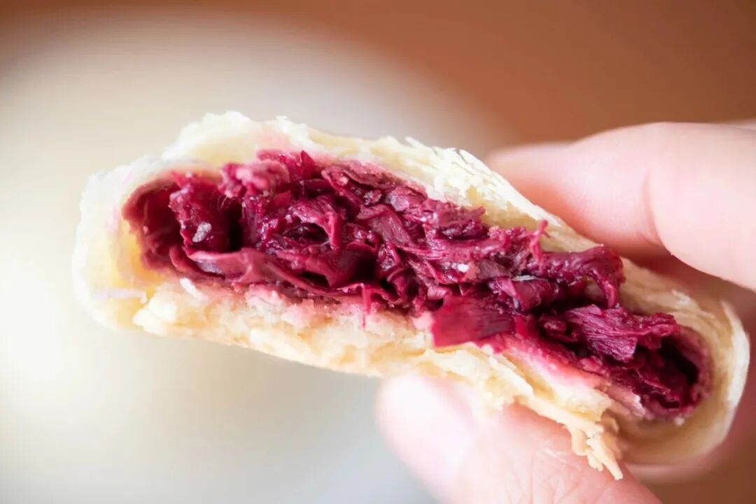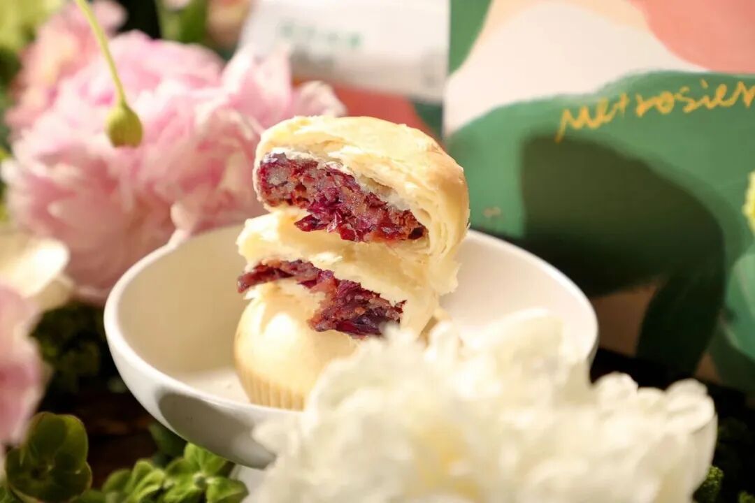 优质面粉加入猪油为皮,层层起酥~入口一瞬,酥皮散落,混着蜜糖的深红花瓣开始撩拨你的唇齿,恍若千万玫瑰在口中次第绽开~