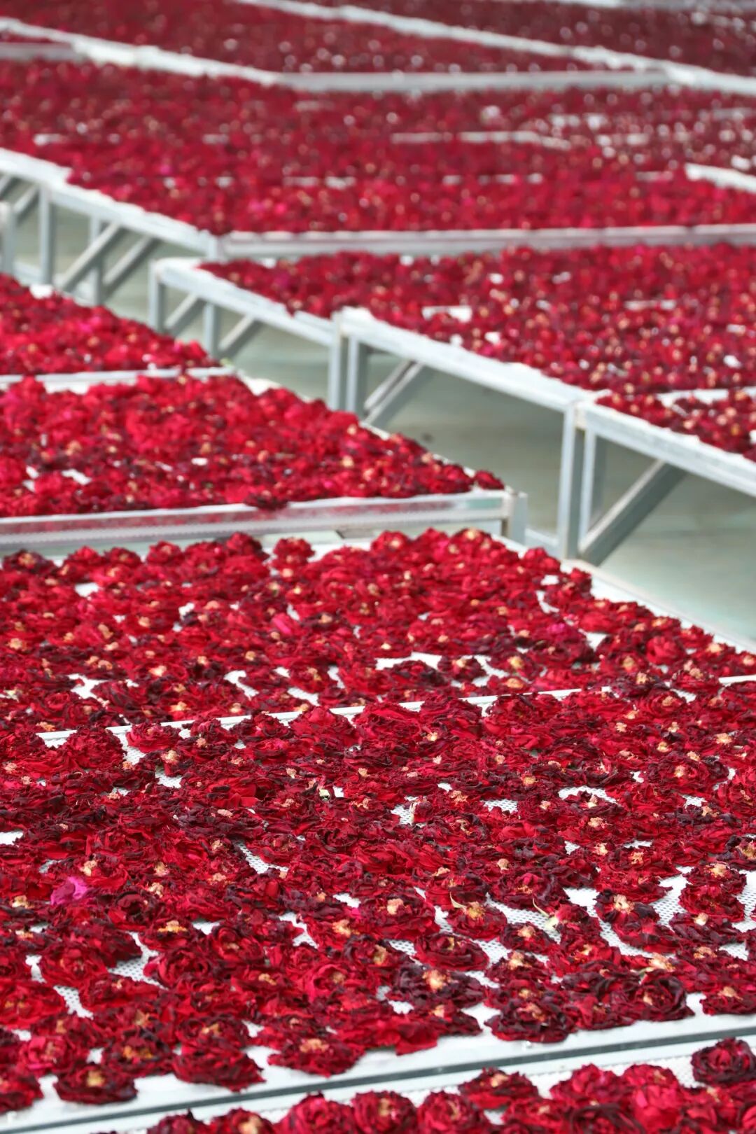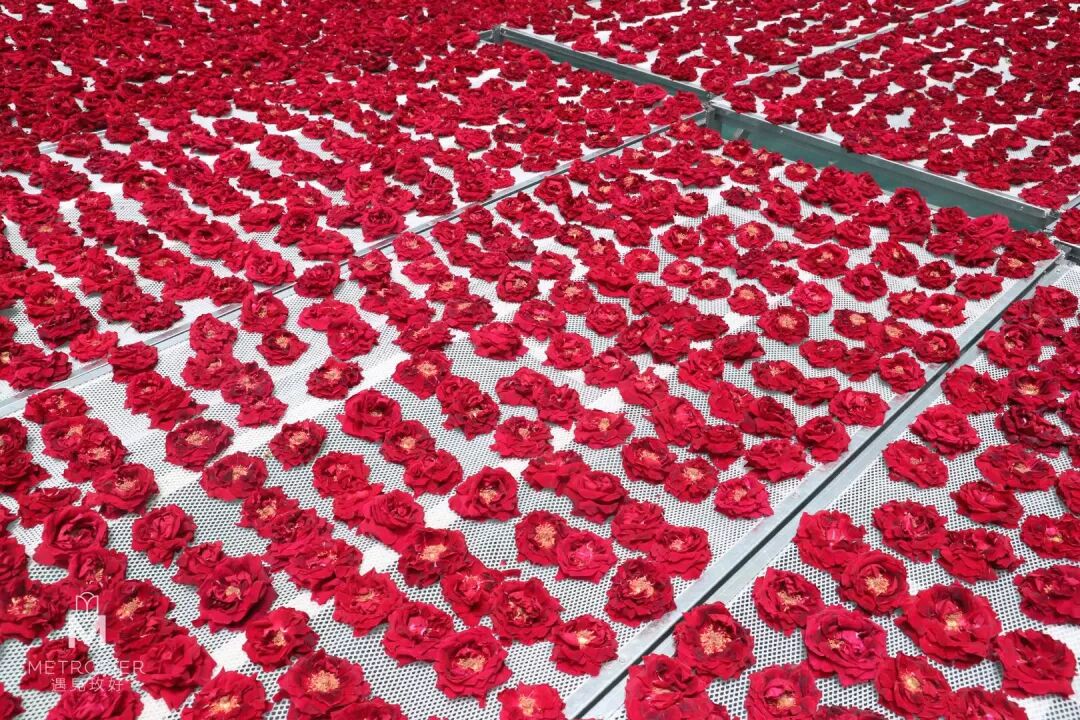 经新鲜采摘的墨红玫瑰,会第一时间送往工厂进行摊晾处理。